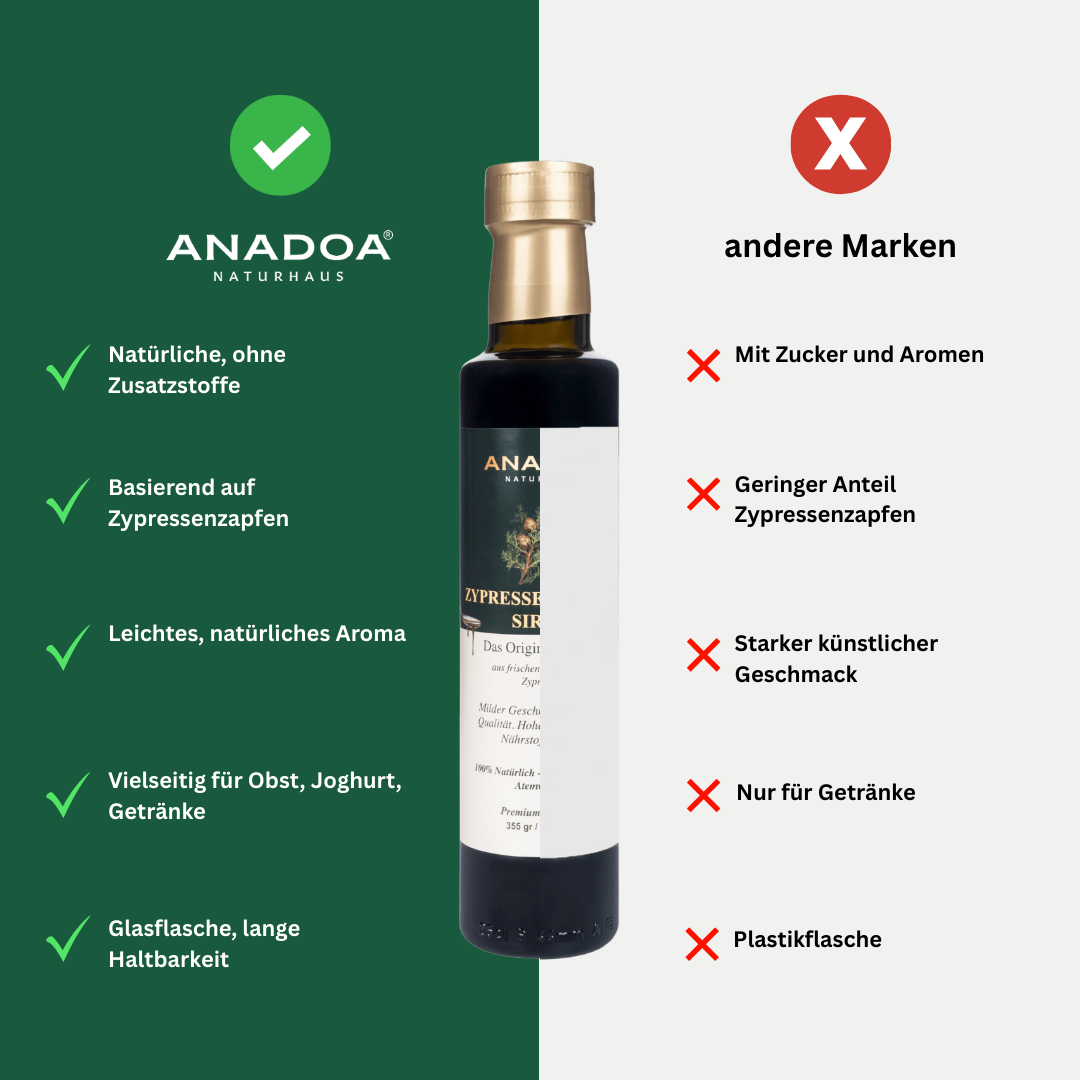 Unser Anadoa Tannenzapfen Sirup wird unter strengen Qualitätsstandards hergestellt, um Reinheit, Authentizität und gleichbleibende Qualität in jedem Glas zu gewährleisten.