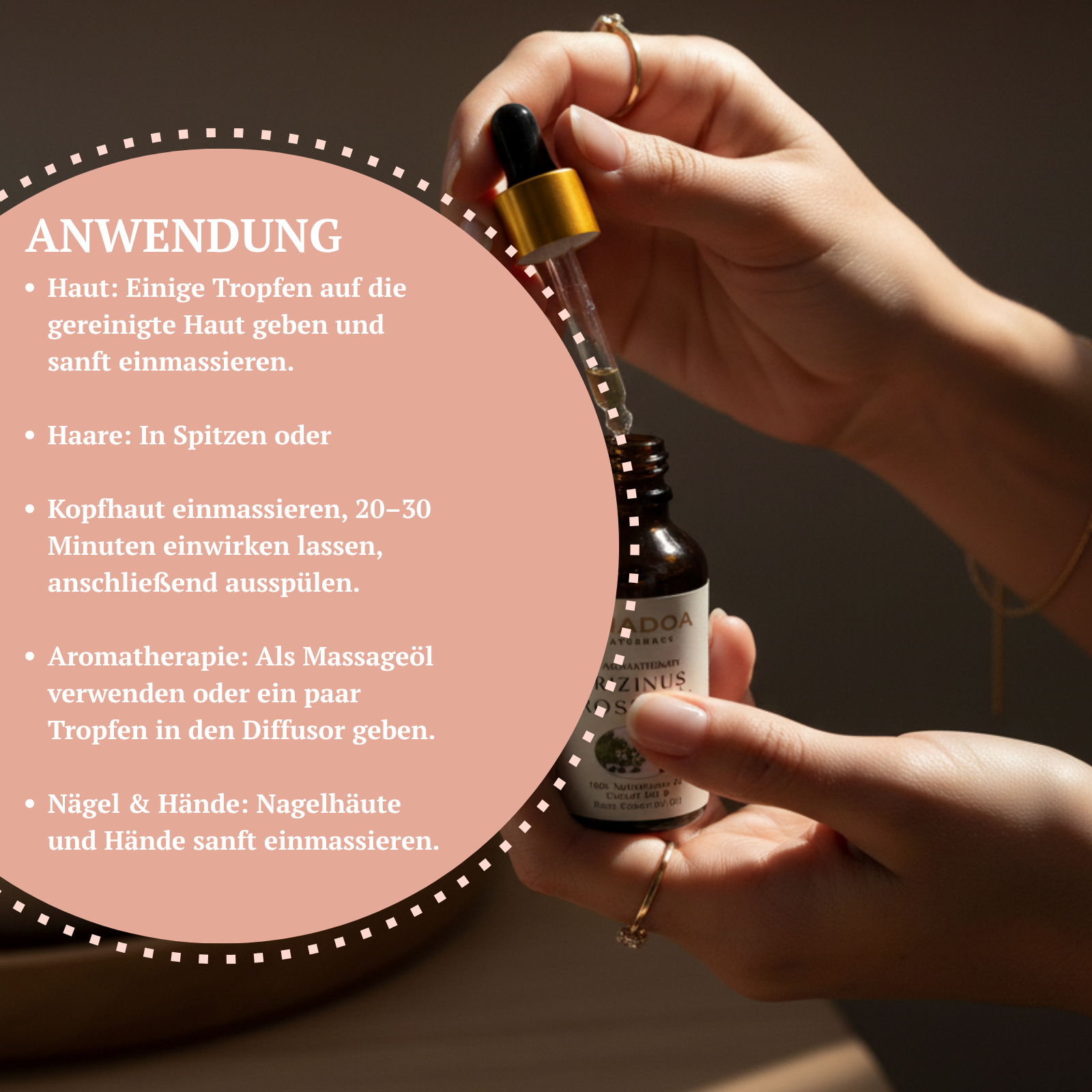 - Hair: Massage a few drops into dry or slightly damp hair. Leave on overnight for an intensive treatment.