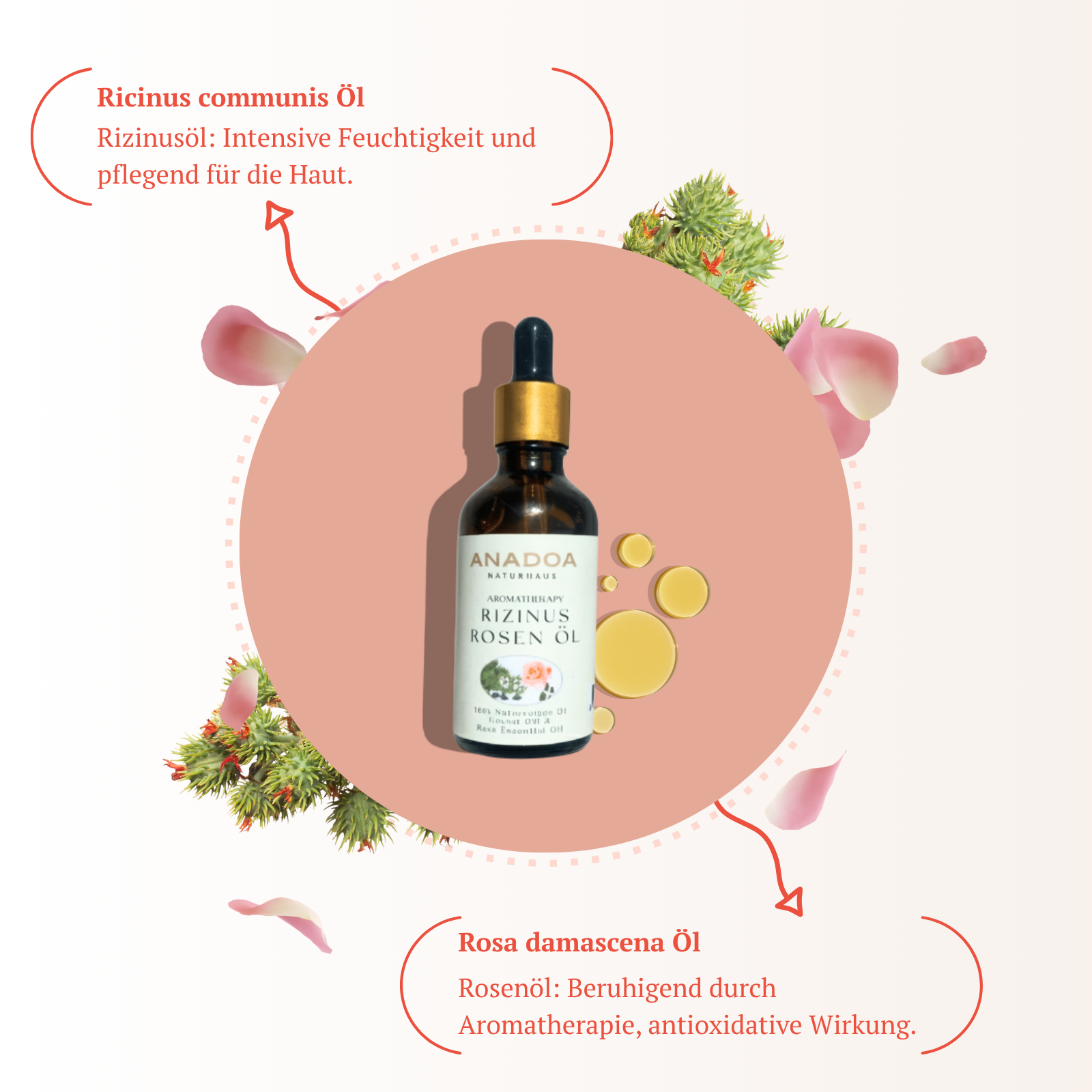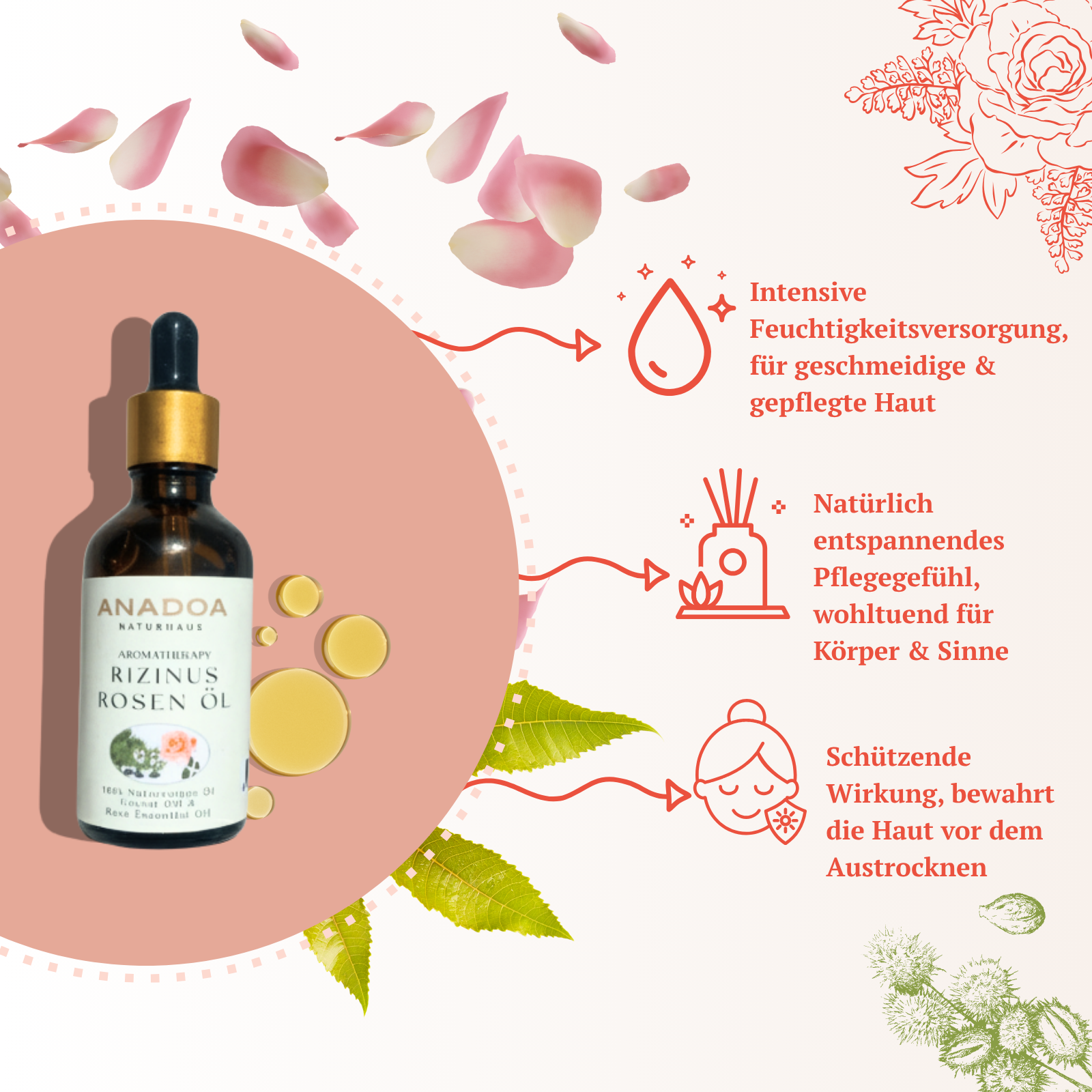 - Rose and castor oil provide the skin with nourishing nutrients, strengthen the skin barrier and help to retain moisture.
